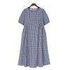 Blue round neck embroidered cotton and linen dress women's 2025 spring and summer new loose casual fine plaid seven-quarter sleeve long dress