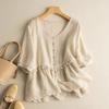 Overweight work! All hand-pressed natural craftsmanship wrinkled cotton and linen loose short five-quarter sleeve round neck pullover shirt women