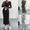 Long Sleeved Round Neck Slit Knitted Long Dress For Women