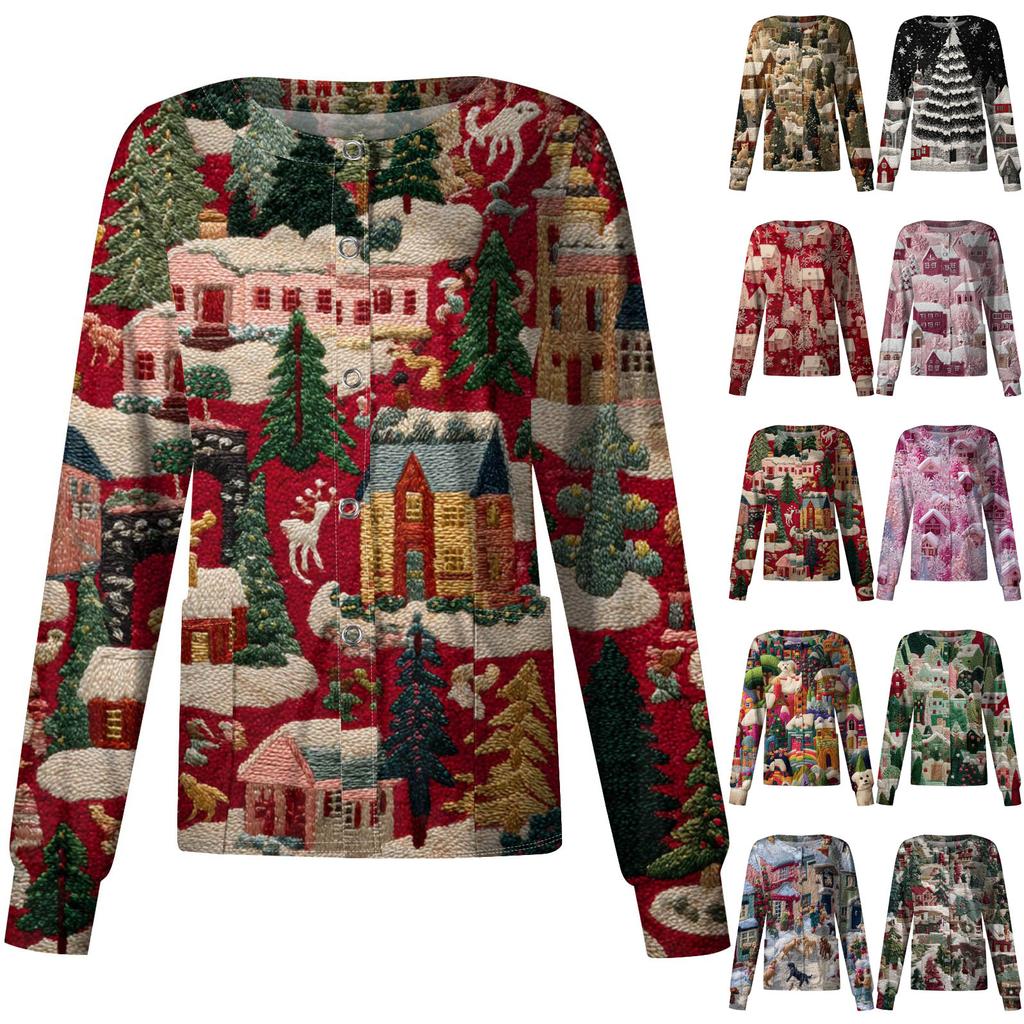 Women's Casual Long-Sleeved Single-Breasted Christmas-Themed Print Cardigan