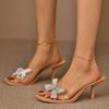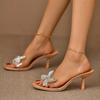 Modische Sandalen für Damen Sommer Neu Schmetterlingsknoten Strass Quadratische Spitze Peeptoe Transparentes Band Dünner Hoher Absatz Bankettschuhe
