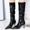 Black Silver Slouch Boots Women's Tall Boots Knee High Stiletto Soft PU Thin High Heels Shoes