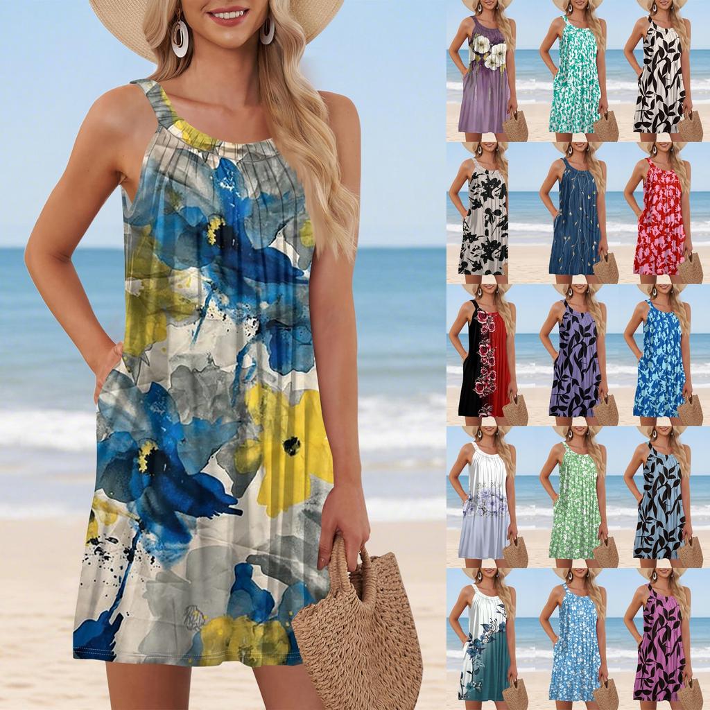 Ladies Fashion Beach Vest Casual Summer Pocket Straps Vintage Floral Print Dress