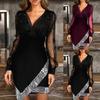 This elegant women's dress is crafted from a blend of polyester and spandex, offering high elasticity and a soft, comfortable feel. The V-neck mesh design exudes sophistication, while the sequined splicing adds a touch of glamour. Perfect for various occasions, this solid color dress radiates elegance and style effortlessly.