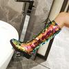 2024 Women Knee High Boots Patent Leather Mesh Hollow Zipper Mid Chunky Heel Soild Pointed Toe Autumn Lady Shoes Bota Feminina