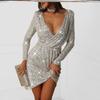 Stil møter eleganse med denne fantastiske aftenkjolen for kvinner med dyp V-hals, paljetter med snøring i midjen og lange ermer for et moteriktig utseende som utstråler selvtillit og raffinement.