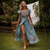 Dame Blomstret Chiffon Swingkjole Lang Kappe V-hals Kort Erme Midje Flytende Sommerkjole Mote