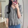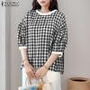 ZANZEA Women Casual V-Neck 3/4 Sleeve Loose Grid Print Blouse