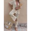 2025 New Fashion Lapel Hollow Lace Short sleeve Top Breasted Shirts Trousers Vacation Set Lace Suit