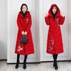 Vinterdun bomullspolstret kvinner Kinesisk nasjonalstil brodert langt yttertøy fortykket varm parkasjakke med hette for kvinner